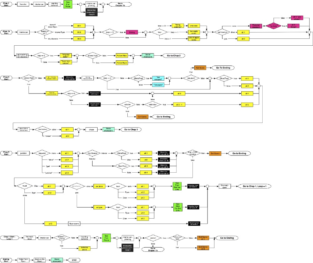 There was over 35 minutes of video and a total of over 300 clips that were controlled interactively. Below is a simplified flowchart for the video part.
