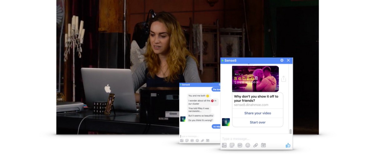 Netflix Sense8 Fanvid Generator allowed fans to create their own fanvideo by chatting with a chatbot impersonating one of the characters in the series. Based on the user interaction during that conversation we rendered a personal, unique video.