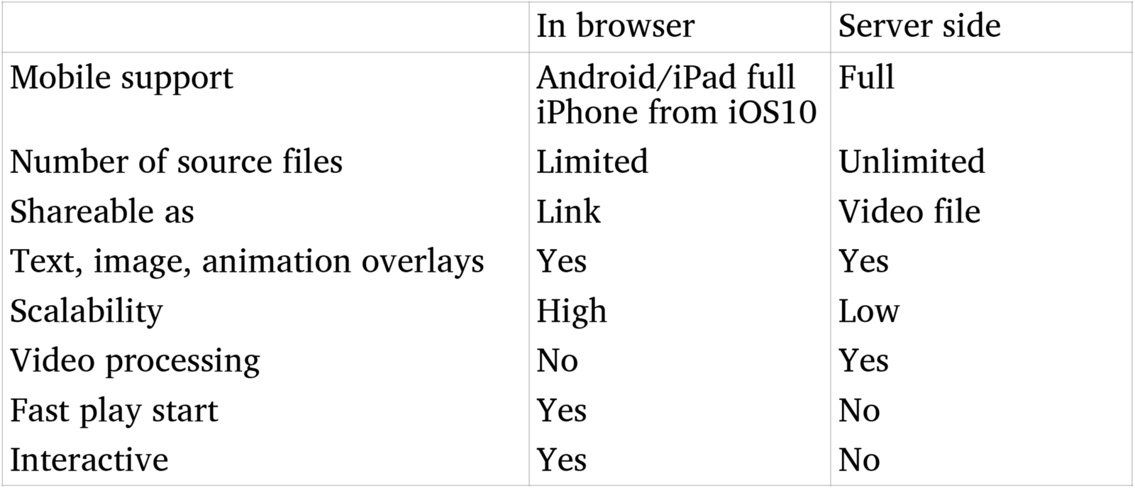 There are two approaches to generate dynamic personalized video. Either the personalization is done in the browser or it is rendered on the server side and then delivered. Both methods have its pros and cons so which to choose depends on the project. Below are the main differences:
