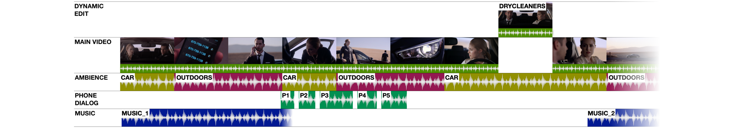In some cases this was not feasible, e.g. dialog or spot sounds that overlaps an edit point between two dynamically edited clips. In those cases we made the sounds separate and triggered them in sync with the video.